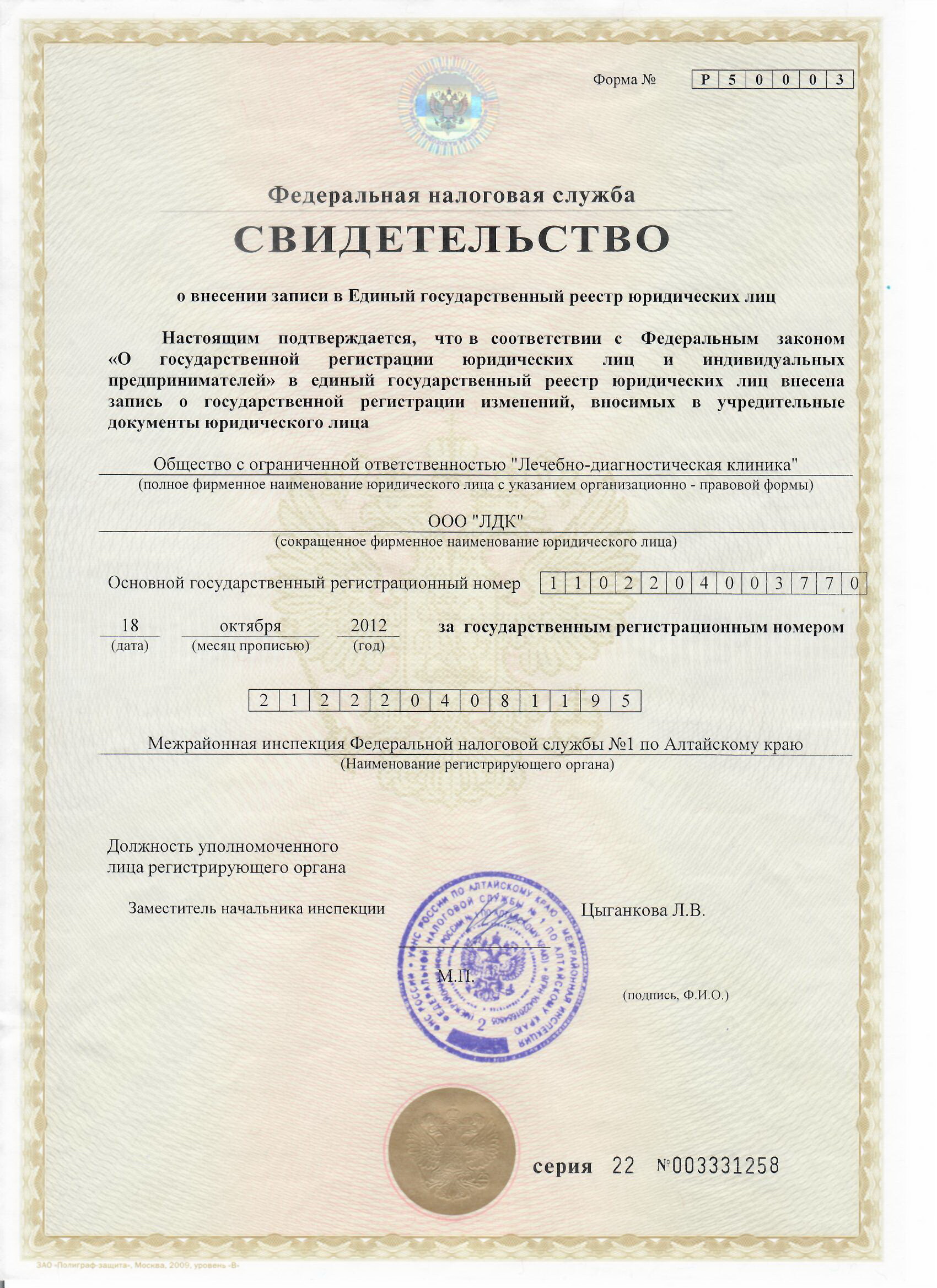 Дата государственной регистрации: 03.10.2010 г. за основным государственным регистрационным номером 1102204003770 выдан Межрайонной инспекцией Федеральной налоговой службы №1 по Алтайскому краю